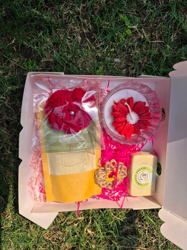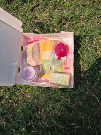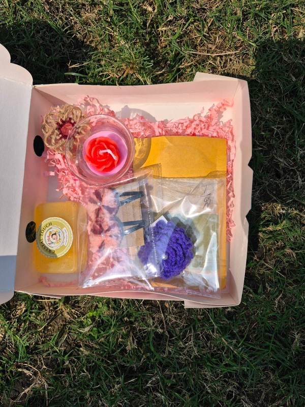 1soy wax fragrance candle, 1ubatan packet, 1jute keychain, 1saffron soap, 1 pair woolen flower hairclip, 1rose woolen hairrubber